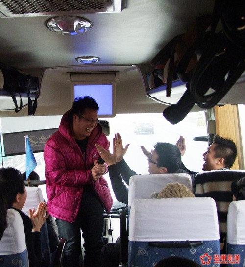 伴随着夜色中的灯光,大巴在6点驶出温州,也开始了接下去两天紧凑的旅程。为早起补睡了一觉之后,车厢里逐渐热闹起来,对于未知行程的兴奋写在每个人的脸上。为了增强团队间的互动,34个同时被安排成了A、B、C、D四组,紧接着,在企划部安排的活动中,4组队员在各个项目中踊跃表现,为团队能获得更多的奖章,得到更为丰厚的奖励努力着。在老牌节目击鼓传花中,被作为“花”的零食代表在车厢内不断做着抛物线运动,nancy的《NO BODY》为车厢内的沸腾拉开了序幕,claudia的西班牙语《生日快乐》、helin的范晓萱版《生日快乐》提前为james献上了生日的祝福,rebecca的《后来》更是引起现场的大合唱,emily则为大家带来了童年的回忆,在狭小的过道里跳起了《我们的祖国是花园》,老牛和文俊以一首歌同场竞技也引来一阵喝彩……我们听到了欢声笑语的此起彼伏,更看到了我们这支团队如此的多才多艺!