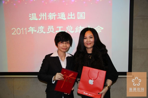 会议表彰了在2011年工作中兢兢业业、表现突出的先进个人,产生了“2011年优秀员工奖”、“最佳贡献奖”、“最具潜力奖”、“最佳新人奖”、“最佳服务形象奖”等 ,分别获得“苹果笔记本电脑”、” IPAD2”、 “IPHONE4S”等由总经理fiona精心挑选的奖品作为奖励,并向全体员工发出了学习的号召。此外FIONA还为在第四季度生日的员工送上了生日礼物和祝福,新通大家庭的氛围溢于言表。
