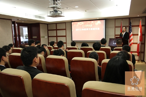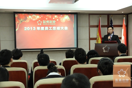 2014年1月25日,温州新通出国举行2013年度员工总结大会。会议共有三项议程,包括年度总结,杰出员工评选和公司总经理Fiona做2014年公司展望。在会上,新通员工纷纷对过去的2013年进行总结,并对刚刚开始的2014年报以众多期望。