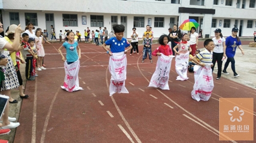 下午1:30分,活动正式开始,校方领导致辞后,我们和孩子们一起愉快地做起了游戏。在这次爱心活动中,我们新通7位同事是14位留守儿童的爸妈,一个同事带着2个小孩,让他们在节日里尽情享受亲子活动带来的快乐!托球跑、迎面接力赛、协同运送篮球、两人三足、“同舟共济”、袋鼠跳……各种各样的互动让现场其乐融融,热火朝天,加油助威的声音和愉快的笑声一直在校园里回荡。