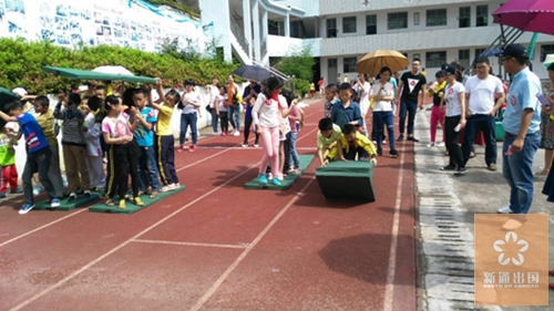 下午1:30分,活动正式开始,校方领导致辞后,我们和孩子们一起愉快地做起了游戏。在这次爱心活动中,我们新通7位同事是14位留守儿童的爸妈,一个同事带着2个小孩,让他们在节日里尽情享受亲子活动带来的快乐!托球跑、迎面接力赛、协同运送篮球、两人三足、“同舟共济”、袋鼠跳……各种各样的互动让现场其乐融融,热火朝天,加油助威的声音和愉快的笑声一直在校园里回荡。