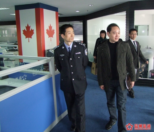 2010年12月29日,浙江省公安厅出入境管理局王科长、温州市公安局出入境管理局李局长、浙江省出入境中介服务行业协会蒋秘书长等一行领导来我司观摩指导,温州新通总经理予以热情接待。